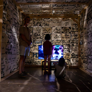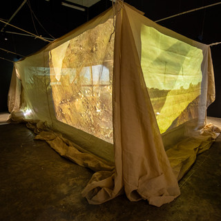 Bringing together contemporary artists from Australia and abroad, this exhibition assembles temporary sanctuaries within and beyond the gallery walls. Rushdi Anwar’s Patterns of Displacement, 2017, made by the children in the school of the Arbat Refugee Camp, in the Kurdistan region of Iraq, focuses on the plight of its youth, the ‘tent’ revealing the names of over 280 children whose identities are largely invisible within a political landscape of ongoing international calamity. A testament to the precarious architecture of war, it sits adjacent to Allison Chhorn’s Skin Shade Night Day, 2022, whose artwork was prompted by experiences of gardening alongside her mother and learning how her family fled the Khmer Rouge. Both large-scale installations examine displace and memory through the architecture of the exiled.