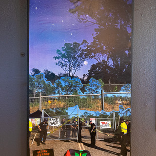 The ever encroaching urban sprawl, the new homes trampling the old, is present also in the work of Cyan Lee and Laniyuk, who offer grounded perspectives on land and the ongoing struggle for justice in the Top End. Recently spurred by the development plans for Lee Point, the two artists and activists have chosen to respond both to the theme and to each other in their same-titled poem and collage Protectors Not Protestors, 2025 — a reflection, more than a year on from the Binyabara encampment, grounded in their shared connection to the land under threat.